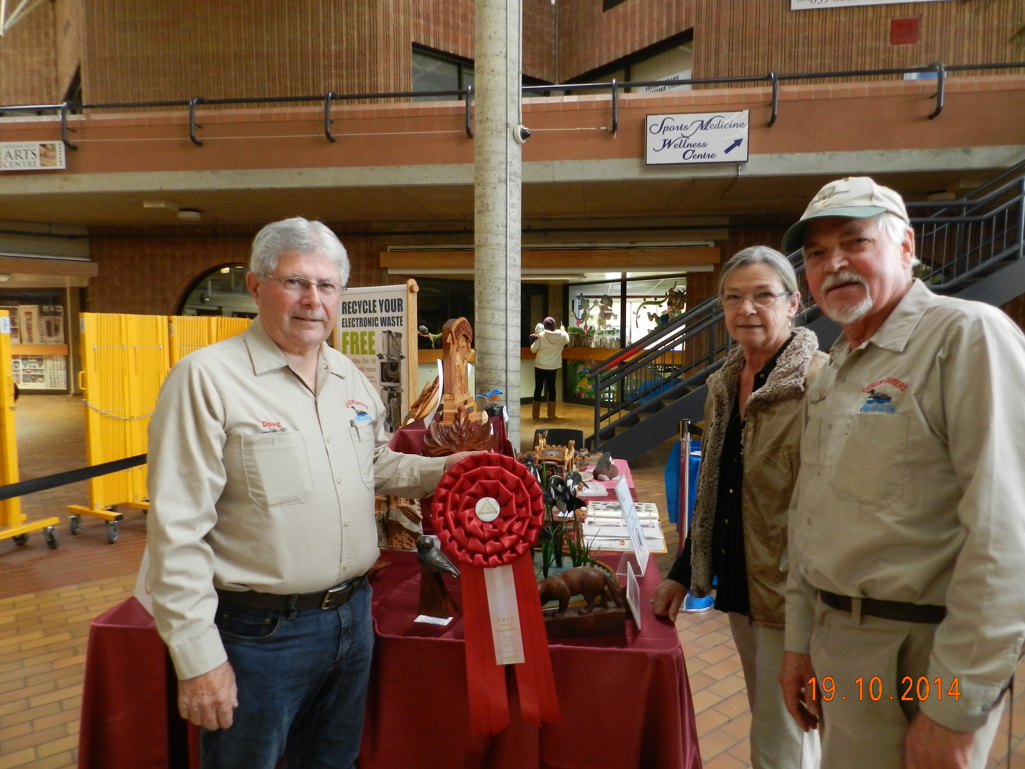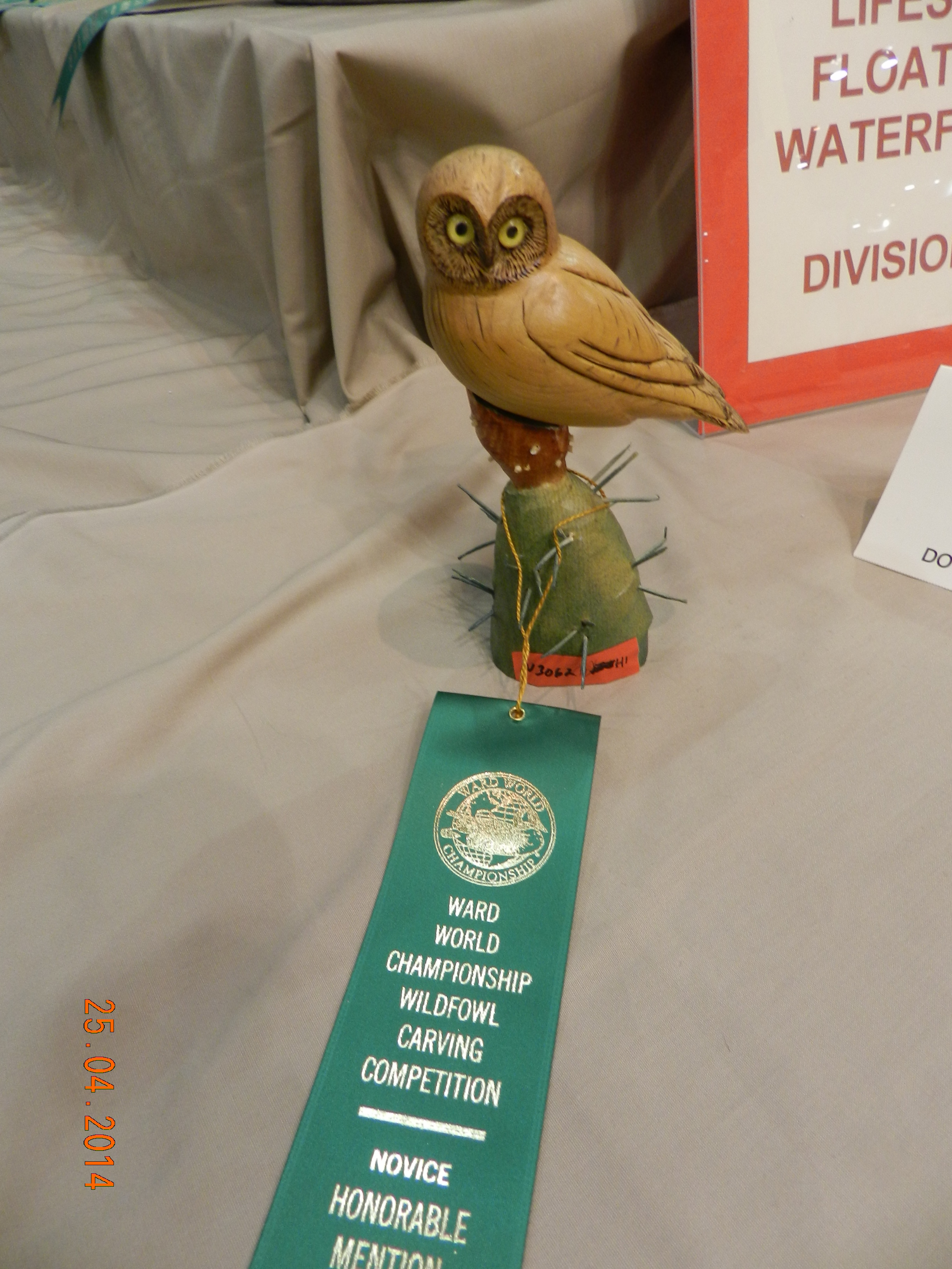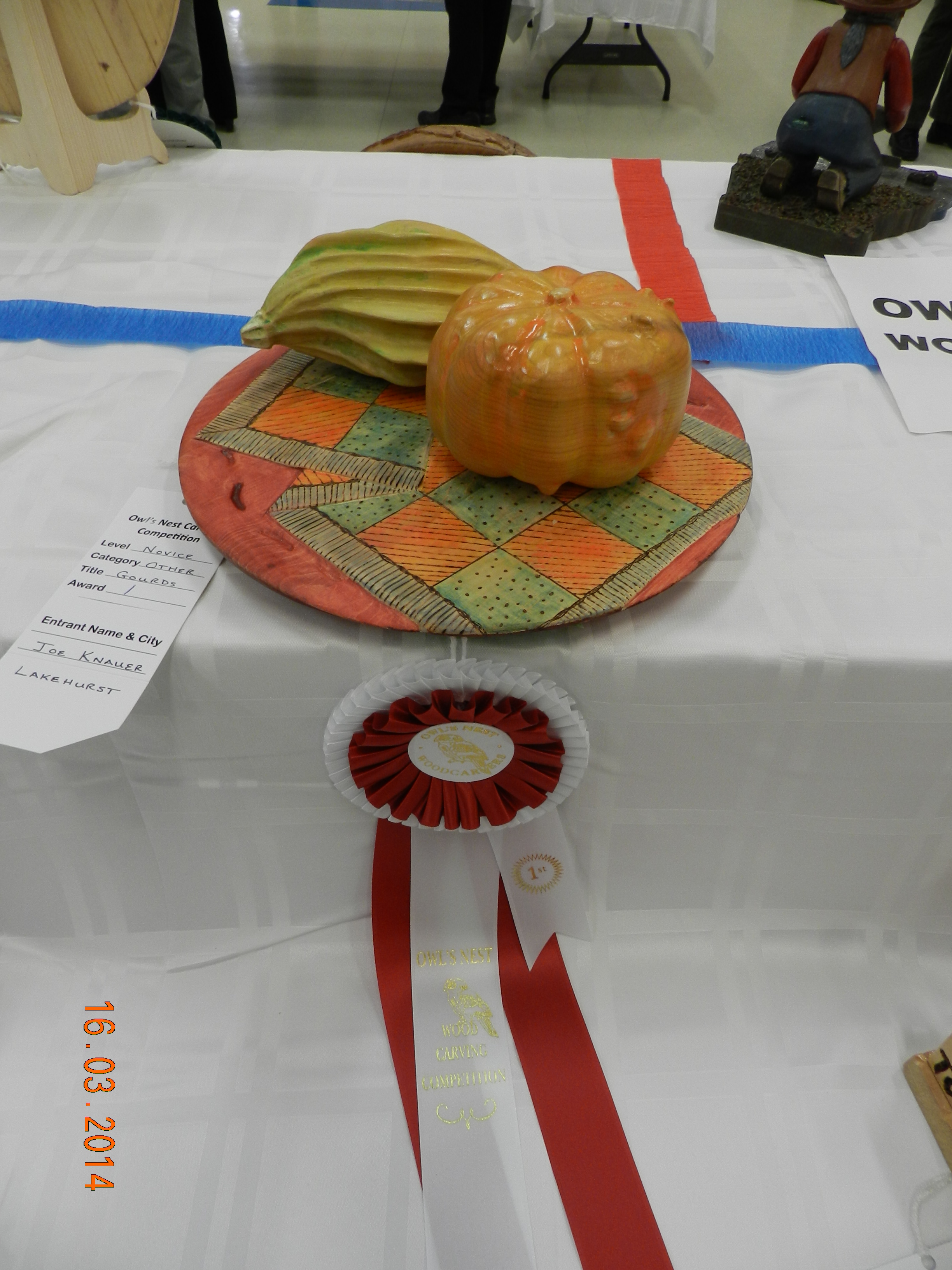 One of the Caygeon Carvers at work with a life sized Loon. It is col out there! Buckhorn January 2014Starting to carve a Gourd (the one on the left is the real one growing in our garden from seeds send by our German relatives)It ended up well at the Canadian National Wildfowl Carving Championship at the Owls Nest Show in Waterloo. In the category “In the round others” March 2014Changed the GROUP OF SEVEN PINE to a scene in winter.The flag of HUNGARY to honour the work of the very active Emma Perlaki as president of the Ontario Wood Carvers Association. It was displayed in a quilt with small carvings from many more carvers.Bob Gill with one of his amazing relief carvings.Trip to Ocean City for the World Carving Championship.Hundreds of amazing carvings…Including this Cuckoo , replacing a lost part of a cuckoo clock belonging to one of my wife’s friends. Not as amazing as some of the others…My little ELF OWL.Some world class carved decoy ducks were judged in the ocean water.Now back in Canada and Belleville for a one week carving lesson with John Leeder.Work in progress with the miniature BLUE HERON.and all the happy carvers in Belleville.Adding the habitat back home in Buckhorn.Some easier work with these BUTTERNUT OWLSThis is a real chipmunk, but would be a great model for a carving…Gord Black from the Buckhorn Carvers is heading the class project to carve and paint a SUNFISHThe Buckhorn Carvers displayed the various stages of their SUNFISH during the carving show in Pickering.The Buckhorn Carvers Club received a huge ribbon for their display in Pickering.Joint Christmas luncheon of the Buckhorn Carvers and Caygeon Carvers at the Buckhorn Community Center.