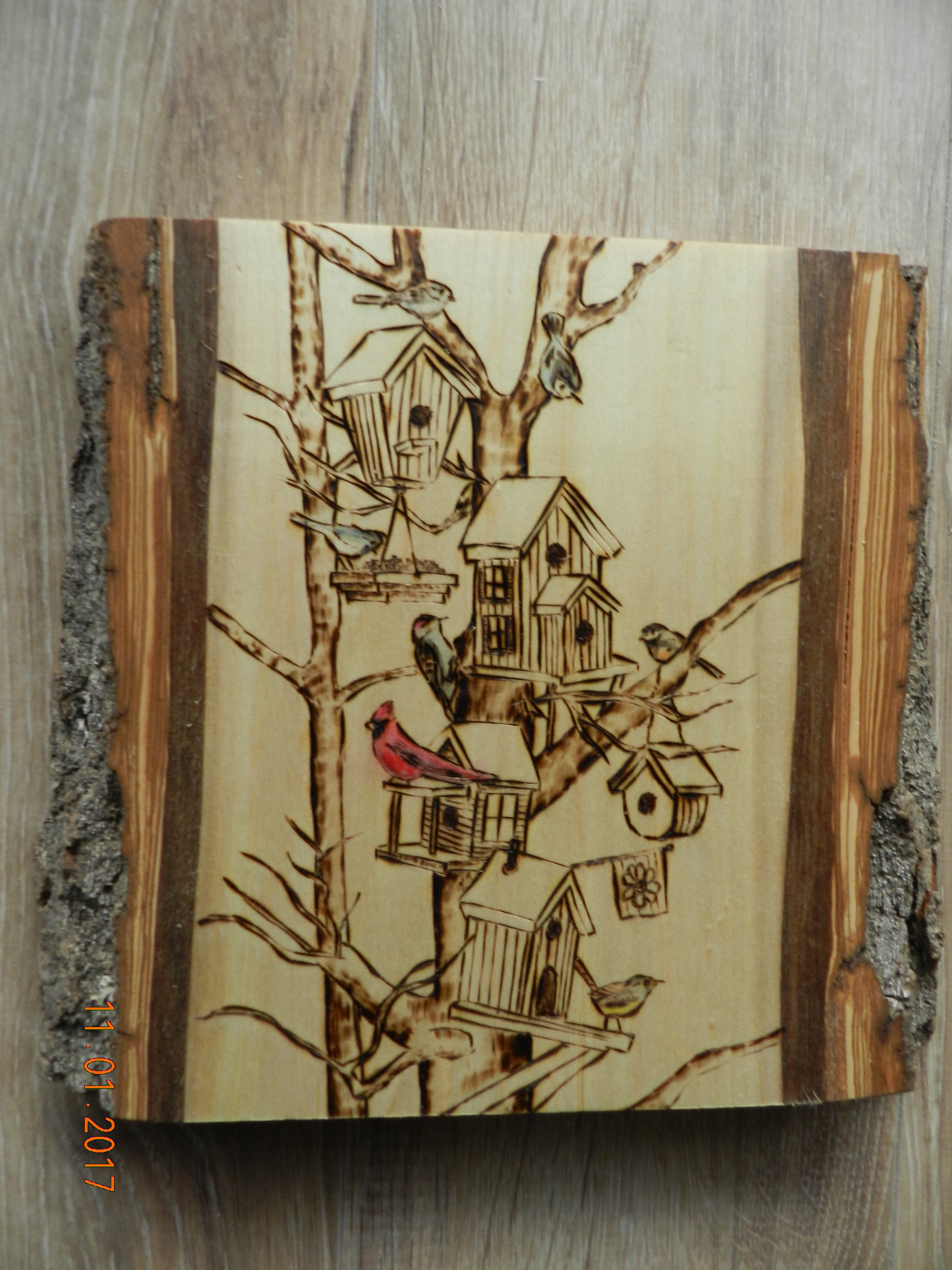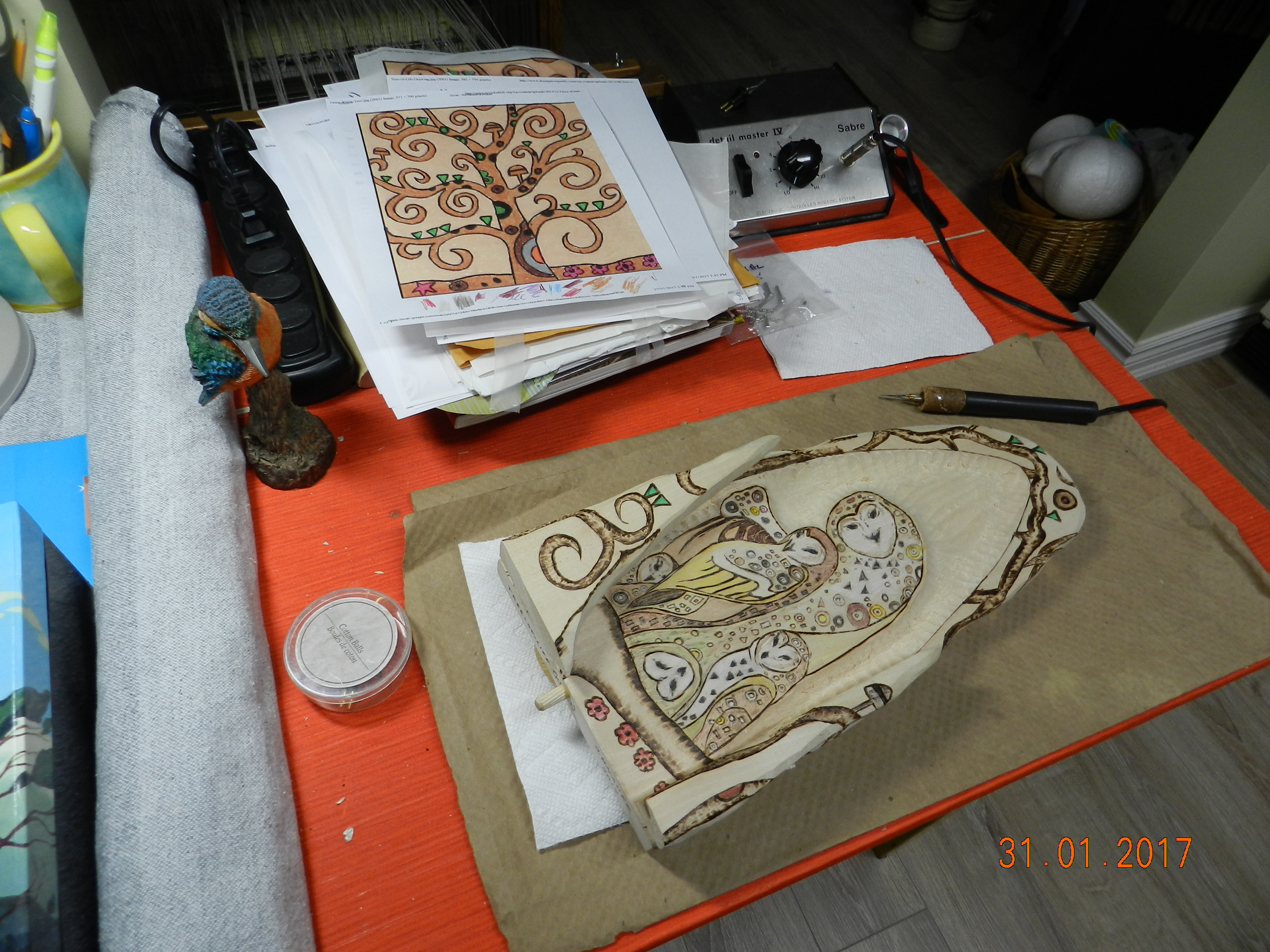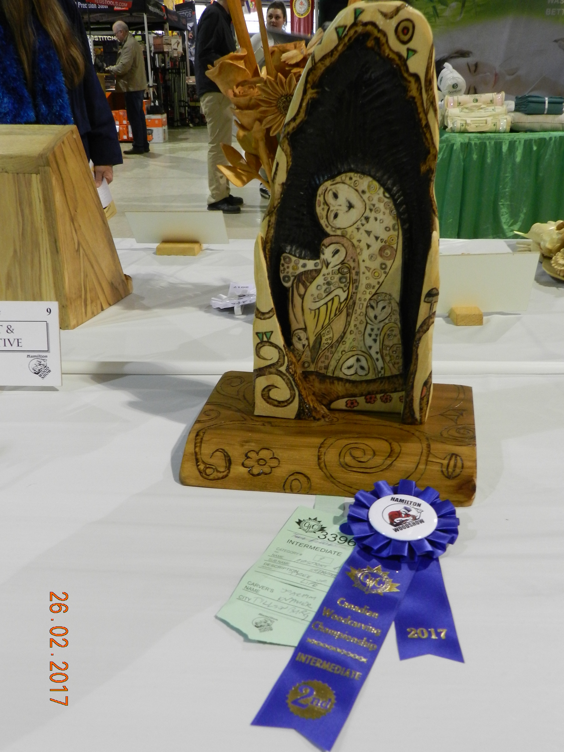 This year a lot more wood burned items and less carvings since my workshop was downsized to a table in the kitchen.That is the kitchen table showing the Klimt inspired wood burning in progress. THE TREE OF LIFEA German bird….. Stieglitz and our local CardinalsLoons in the style of a native Artist around Peterboroughand another work in progressMike, a carver from the Otterville club at the carving show in HamiltonAdded some ribbons at the Hamilton showNo ribbon for this Unicorn… the horn is at the wrong spot…mentioned by one of the judgesA visit to the Ingersoll Cheese & Agricultural Museum displaying this huge 20 feet long carving of some settlers arriving. Definitely worth a visit.The above carving was done by Wilson JohnstonBack to some real carving… A stylized HERON in Catalpa wood. Was well received at the Kawartha Carving Show in Bobcaygeon.Kawartha Carving Competition in Bobcaygeon.Getting ready for Christmas !