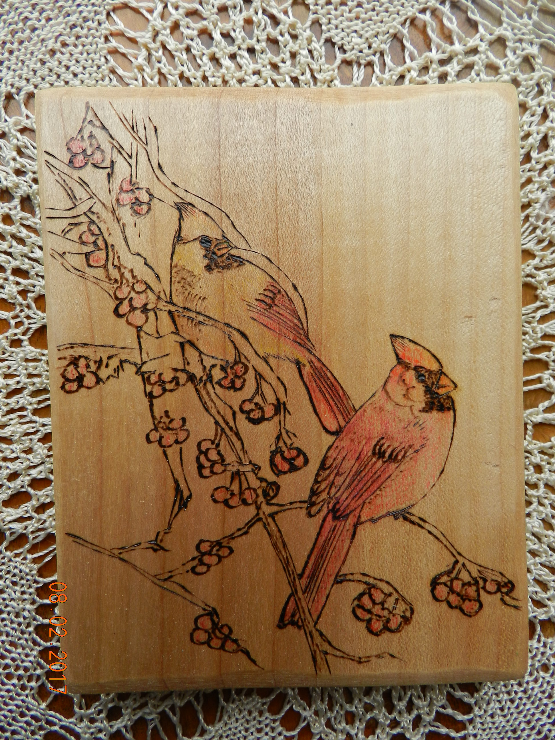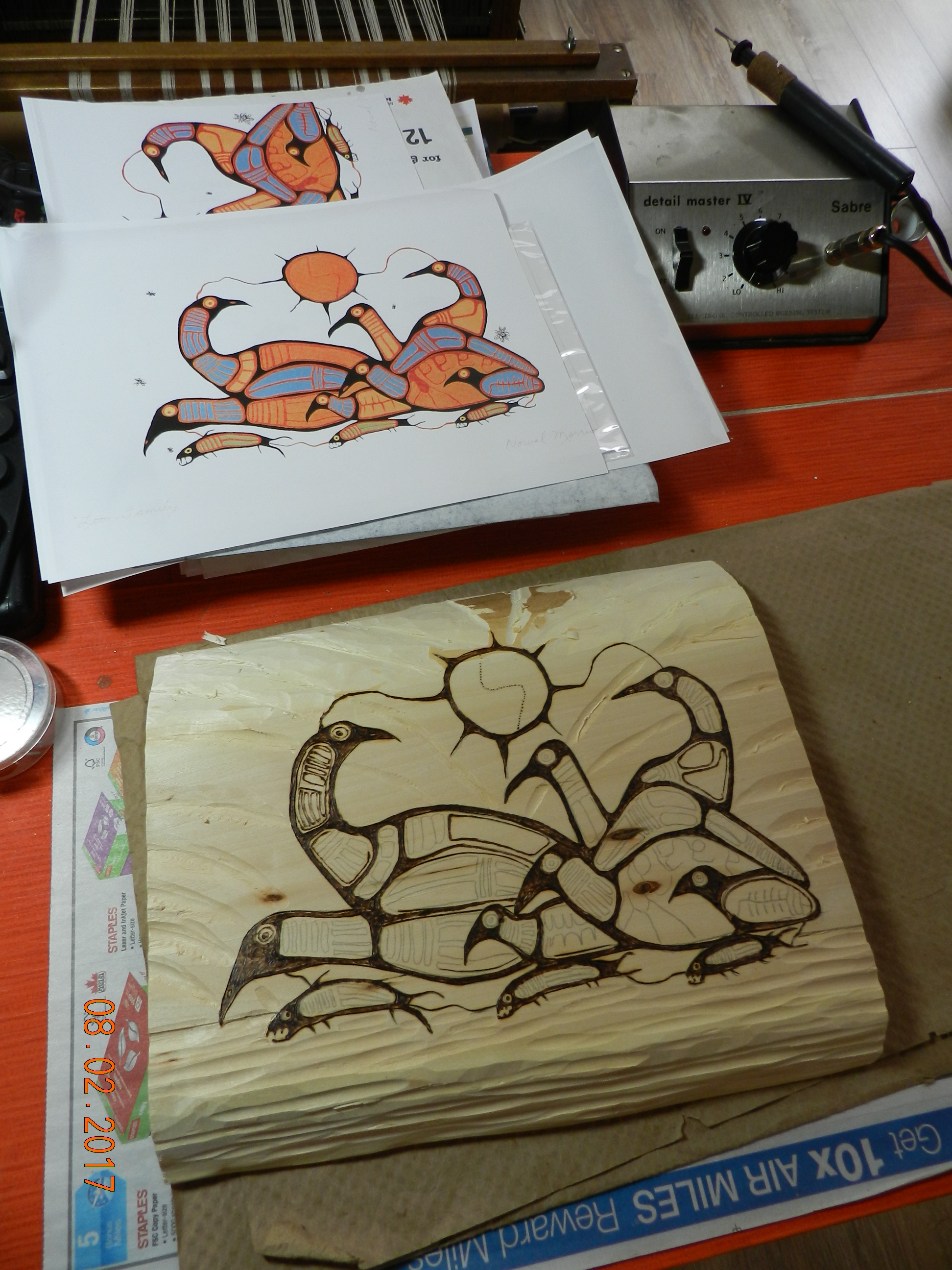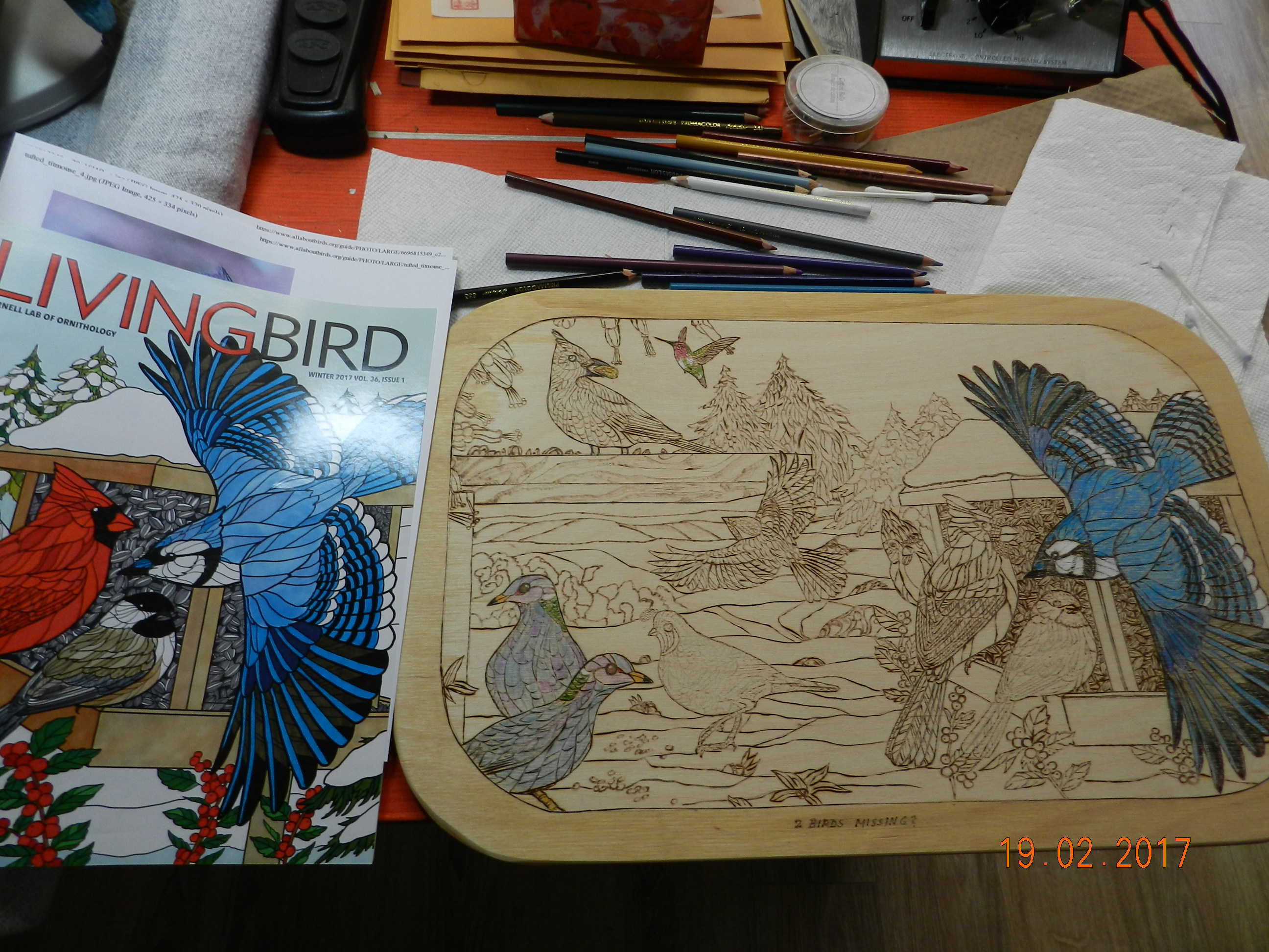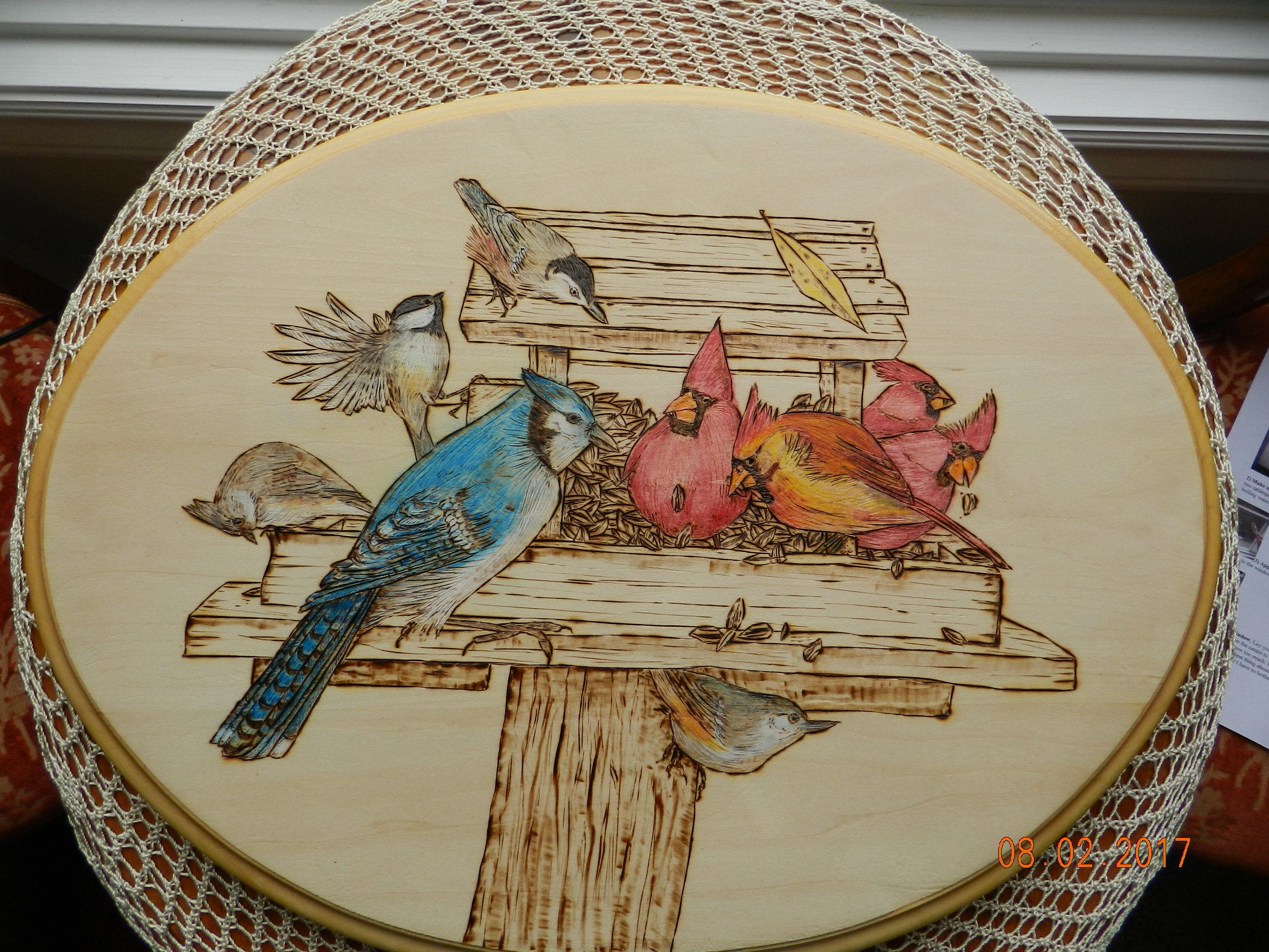 This year a lot more wood burned items and less carvings since my workshop was downsized to a table in the kitchen.That is the kitchen table showing the Klimt inspired wood burning in progress. THE TREE OF LIFEA German bird….. Stieglitz and our local CardinalsLoons in the style of a native Artist around Peterboroughand another work in progressMike, a carver from the Otterville club at the carving show in HamiltonAdded some ribbons at the Hamilton showNo ribbon for this Unicorn… the horn is at the wrong spot…mentioned by one of the judgesA visit to the Ingersoll Cheese & Agricultural Museum displaying this huge 20 feet long carving of some settlers arriving. Definitely worth a visit.The above carving was done by Wilson JohnstonBack to some real carving… A stylized HERON in Catalpa wood. Was well received at the Kawartha Carving Show in Bobcaygeon.Kawartha Carving Competition in Bobcaygeon.Getting ready for Christmas !