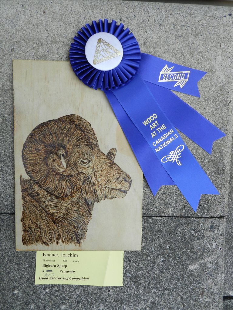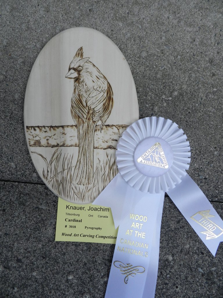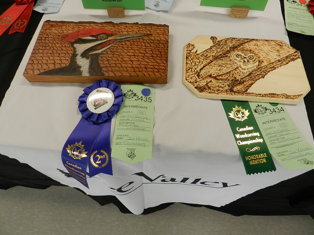 and Burrowing Owl ,Honourable mention ribbon, woodburning